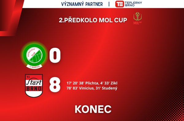 Start Brno potvrdil roli favorita a v utkání 2. předkola MOL Cupu si připsal suverénní vítězství 8:0 na půdě SK Skaštice. O jednoznačném průběhu rozhodl už první poločas, kdy naši hráči nasázeli domácím šest branek.
