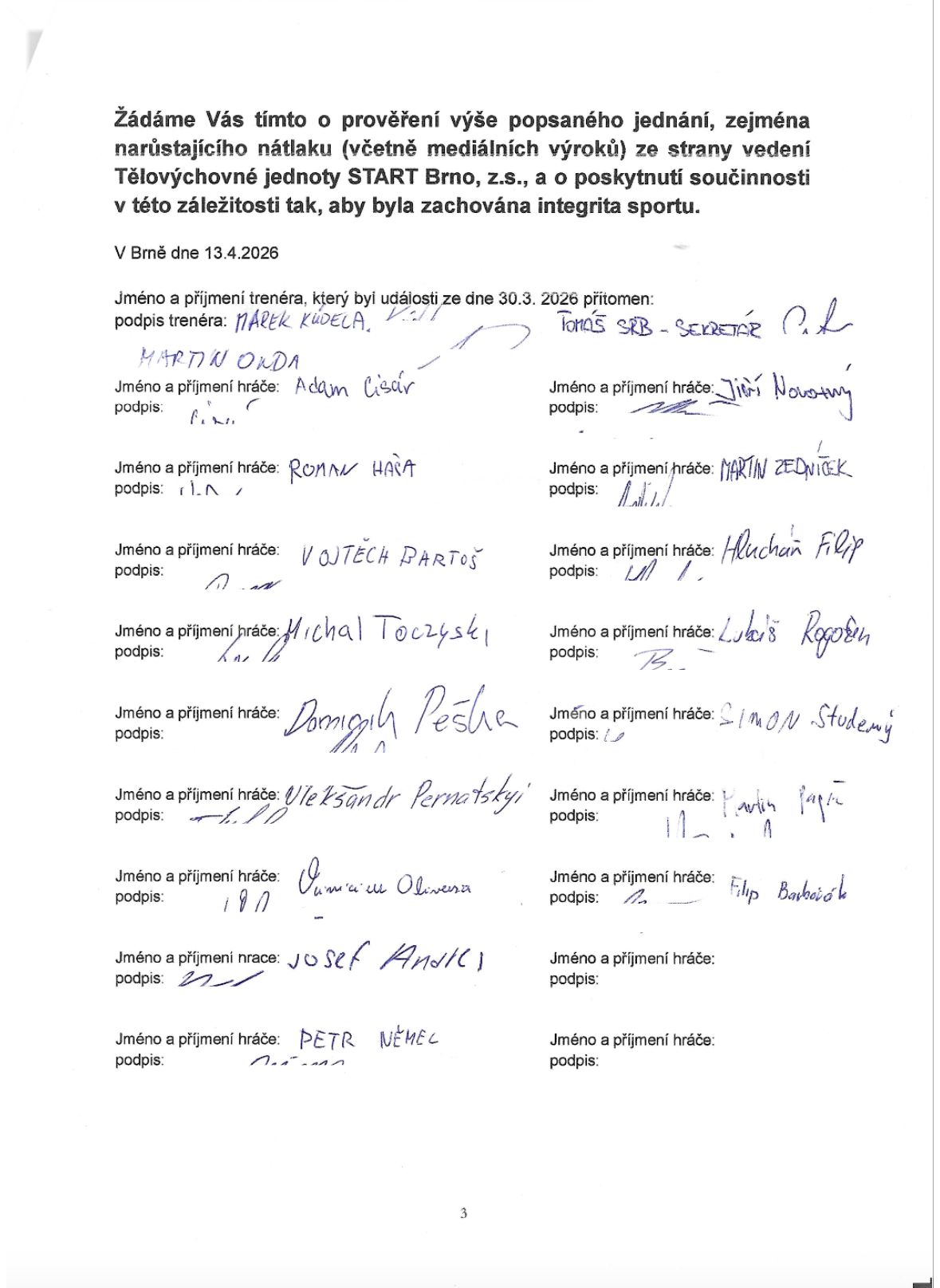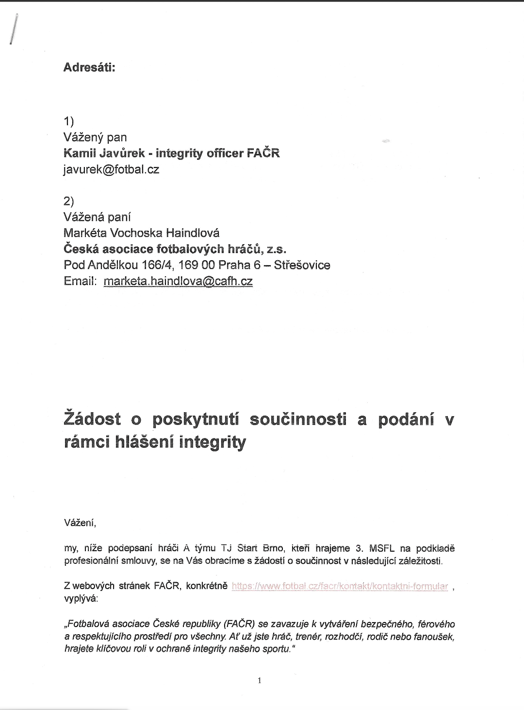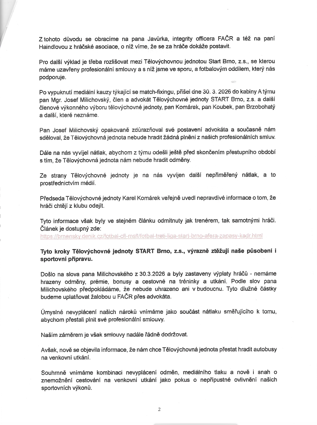 Vážení fanoušci, v návaznosti na aktuální postoj Tělovýchovné jednoty START, z.s. vůči fotbalovému oddílu, se hráči A týmu rozhodli obrátit na FAČR i hráčskou asociaci. Vzhledem k tomu, že se v poslední době ohledně A týmu šíří nepravdivé informace, považujeme za důležité uvést věci na pravou míru. Proto zveřejňujeme žádost adresovanou FAČR a hráčské asociaci, kterou vlastnoručně podepsali hráči a trenér A týmu. Žádáme Vás i nadále o podporu v nadcházejících utkáních. Děkujeme.
